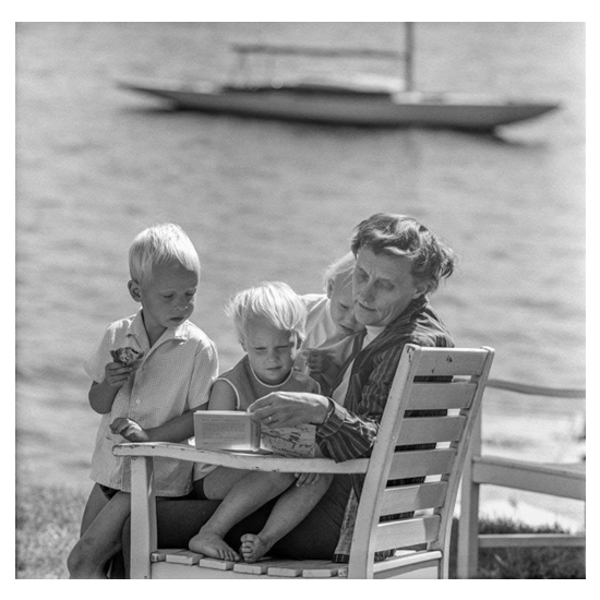 Bild: Astrid Lindgren läser för barnbarnen, med sin Mälar 30 i bakgrunden med namnet ”Saltkråkan”, som hon köpt av sin chef Hans Rabén. Sommarhuset i Furusund i Stockholms skärgård inspirerade till boken, tv-serien och filmerna om barnen på Saltkråkan. Nu sänds en nyversion av Saltkråkan på SVT. Fotograf: Ulf Stråhle/SVT