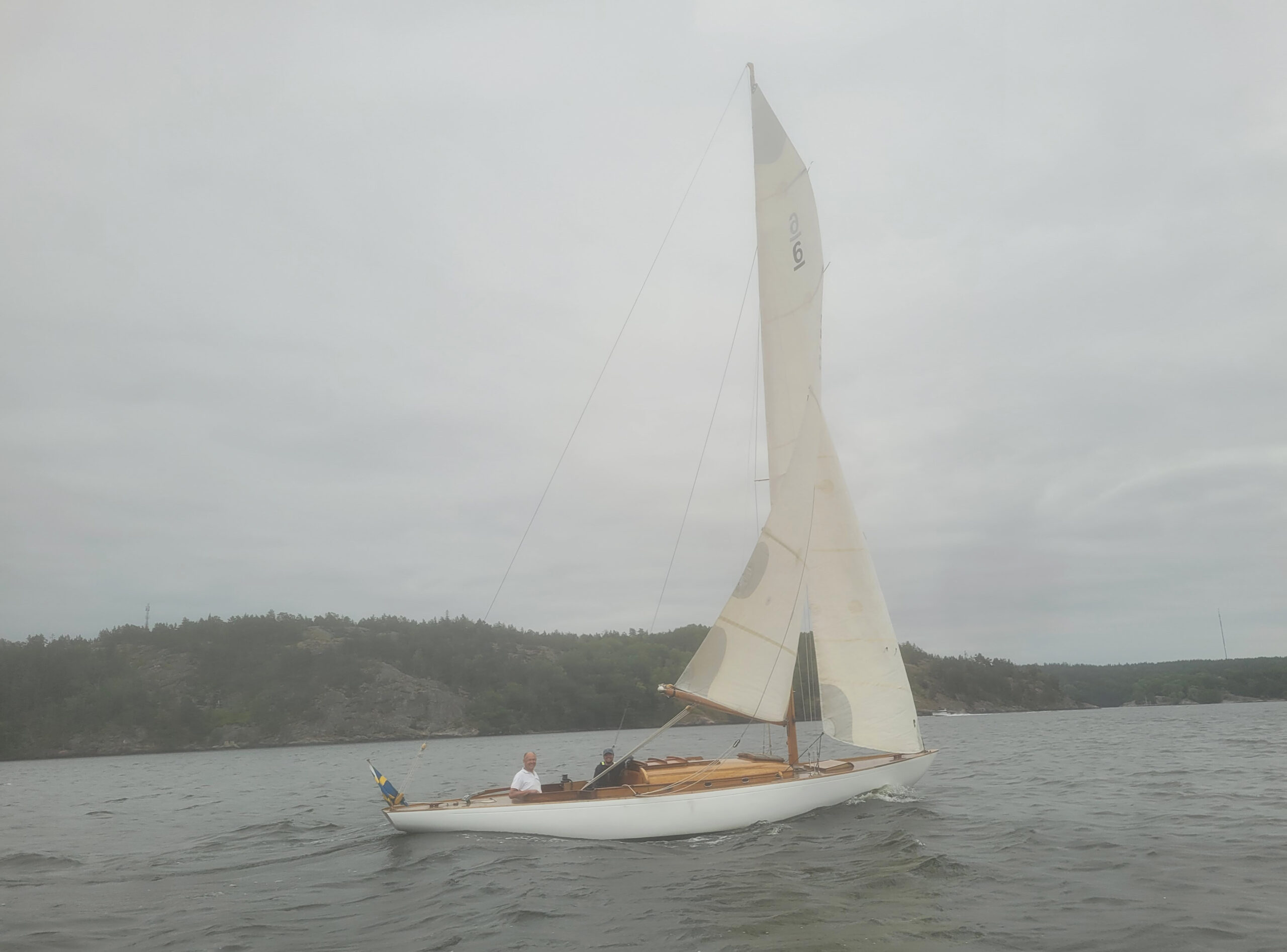 När vi köpte henne var hon gravt underriggad med 30 kvm istället för 49 kvm i original i krysstället så från 2019 för hon nu 41 kvm via förlängd mast och ny bom.