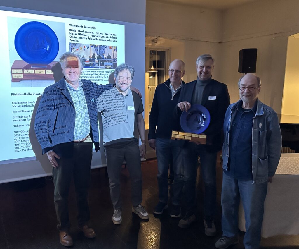 Team AfS står för de båtägare som ställde ut sina båtar på Allt för Sjön 2024, för vilket de tillsammans vann priset Förtjänstfulla insatser. Från vänster ser vi förutom prisutdelaren Ulf Aronsson, Martin Prieto Beaulieu med Edda, Janne Nystedt med Pani, Johan Öhlin med Dobra Kusa och Hans Himbert med Lovisa. Med på bilden var inte Sven Frenkel med Stella Polaris, Börje Drakenberg med Dess samt Claes Westman med Siri.